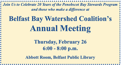 Join us to celebrate 20 years of the Penobscot Bay Stewards Program and those who make a difference at Belfast Bay Watershed Coalition’s Annual Meeting on Thursday, February 26th from 6pm-8pm at Belfast Free Library. More information at: https://www.belfastbaywatershed.org/event-details-registration/annual-meeting