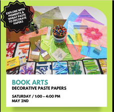 We will begin this class with paste papering. Like adult finger painting, this is a wet, seemingly sloppy, but intentional method of decorating paper. In this class we will explore different types of pigments combined with wheat paste to decorate papers. Using various scraping tools to create multiple textures. Allowing those to dry a bit, the second half of class will focus on the basics of collage.