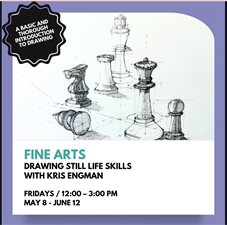 A basic and thorough introduction to drawing, working from a variety of still life setups. For those who love to draw, a drawing fundamentals refresher experience is a bonus. In this 6-week class, we’re going to take the "still life" to a new level. We’ll go beyond representation of the arrangement itself, to finding structure on the page. This means thinking about basic drawing issues: size and placement of information/ accurate measurement/ figure-ground interaction/ editing/ focal points/ compositional integration/ managed mark making. Drawing is about taking what we see and translating it into the language of the visual. No experience necessary, great for beginners and as practice sessions for those who love to draw! Materials list will be provided upon registration.
