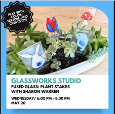 Create 2 unique plant stakes or use the available glass to express your own creativity in this fused glass class. Have fun learning how to work with different types of glass in this 2 and ½ hour workshop! Each student will learn to cut and shape sheet glass using both hand tools and bit grinders. Your unique art will be fired to a tack fuse, creating a textured work of art to display on a shelf or windowsill. Your beautiful creation will be available for pick-up the week following the class.
