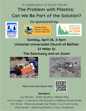 In celebration of Earth month, please join us for The Problem with Plastics: Can We Be Part of the Solution?, a community program sponsored by Belfast Bay Watershed Coalition, Friends of Harriet L. Hartley Conservation Area, and Waldo Climate Action Coalition. Sunday, April 26 Speakers will cover water quality in Belfast Bay, microplastics in wastewater, reducing single-use plastics in our community, and reducing plastics in the household. More information and the Zoom link are available here: